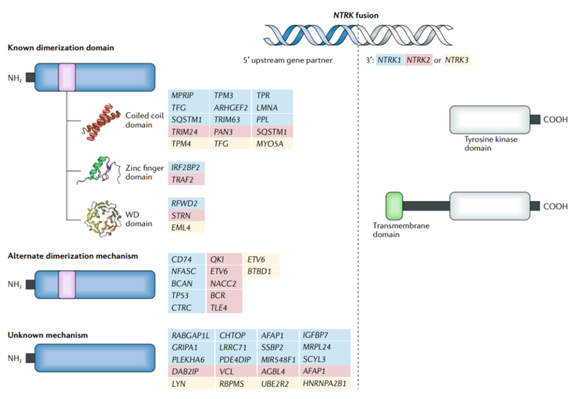 深入研究揭示,NTRK基因除了在神经系统中发挥生理功能,其异常活化更是多种肿瘤发生发展的关键驱动因素。NTRK可通过基因突变、表达水平异常升高或基因融合等多种机制被激活,其中,尤以NTRK基因融合最为常见,也最具临床意义。