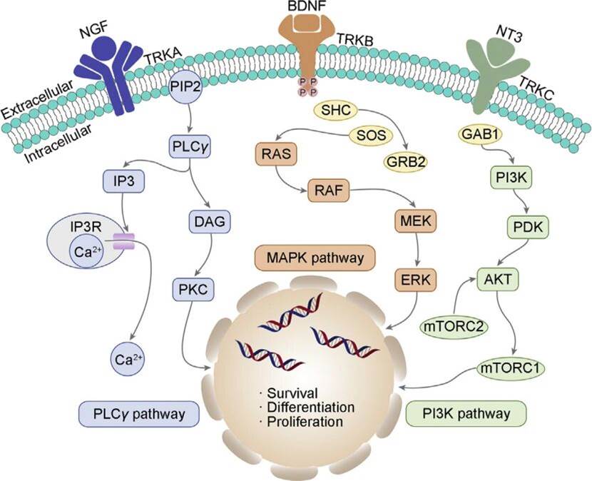 其功能通过特异性配体-受体结合实现:神经生长因子(NGF)主要结合TRKA;脑源性神经营养因子(BDNF)及神经营养因子-4(NT-4)偏好结合TRKB;而神经营养因子-3(NT-3)虽可与三种TRK受体作用,但对TRKC亲和力最高。配体结合后激活下游关键信号通路——包括Ras/MAPK、PI3K及PLC-γ等,进而调控细胞生长、分化与存活。