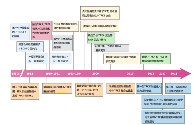 与 TRK 信号转导的生物学和治疗靶向相关的关键进展时间轴